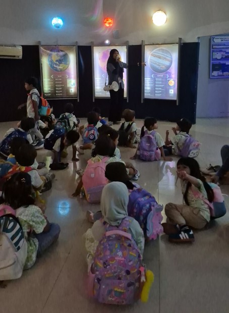 Setelah film selesai kami menuju tempat yang sangat dinantikan selama fieldtrip ini yaitu Planetarium. Disini kami menonton simulasi benda-benda ruang angkasa seperti tata surya serta benda-benda langit termasuk rasi bintang. Anak-anak sangat bersemangat hingga tak henti-hentinya berkomentar “wahhhh” selama pertunjukan berlangsung. Sungguh pengalaman yang luar biasa.